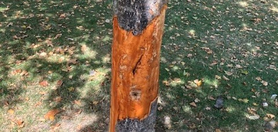 Auf dem Spielplatz am Martinsschloss in Oberlahnstein ist es zu einem besonders schweren Fall von Vandalismus gekommen. Unbekannte Täter haben die Rinde einer jungen Mehlbeere (Sorbus) ringsum abgeschält. Dieser Eingriff bedeutet das sichere Absterben des Baumes, da durch das Entfernen der Rinde das darunterliegende lebenswichtige Cambium zerstört wird. Ohne diese dünne Gewebeschicht können Wasser und Nährstoffe nicht mehr transportiert werden – der Baum ist damit zum Tode verurteilt.