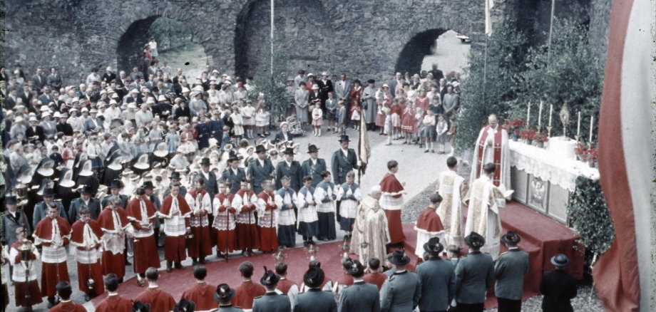 In dieser Folge wird der Standort des Zwischenaltars, der zu Fronleichnam in den 1960er Jahren in Oberlahnstein aufgebaut wurde, gesucht. Wo genau feiert hier Pfarrer Paul Hergenhahn mit den Gläubigen die Messe? Im Vordergrund sind Messdiener, Schützen, Kommunionkinder und die Schwestern zu sehen.