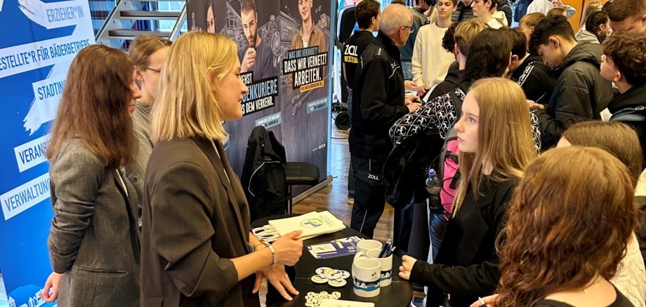 Vorgestellt wurden die Berufe (m/w/d) Erzieher, Fachangestellte für Bäderbetriebe, Stadtinspektor, Veranstaltungskaufleute, Verwaltungsfachangestellte und Verwaltungswirt. Die Jugendlichen konnten sich direkt vor Ort ein Bild davon machen, wie vielfältig und zukunftssicher eine Ausbildung im öffentlichen Dienst ist und welche Perspektiven sich danach eröffnen. Sie nutzten die Gelegenheit, konkrete Fragen zu den Berufsbildern, Bewerbungsabläufen und Karrieremöglichkeiten zu stellen und erste Kontakte zu knüpfen.